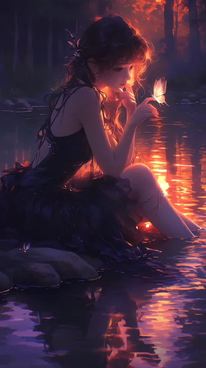 Midjourney Bot 更新时间:2026-03-27 00:26一位成熟御姐气质的东亚女性,三十岁左右,五官清冷如画,眉眼间有淡淡的疏离感。黑色长发垂落肩头,发尾微卷,被暮色染上一层暖光。 她坐在溪边的石头上,身后是潺潺流水与傍晚的树林。她的左手抬起,食指轻触唇边,一只半透明的月牙蝶停在指尖,蝶翼薄如蝉翼,在暮光中泛着珍珠般的光泽。她的目光低垂,看着蝴蝶倒映在水中的影子,神情安静而沉溺。 光影:日落时分,暖橙色的光线从侧面照来,在她脸上形成柔和的明暗过渡。水面反射着天空的颜色,波光粼粼,在她身上投下细碎的光影。整体色调为暖紫、橙红与深绿。 构图:半身,侧脸,手指与蝴蝶成为画面的视觉延伸,背景是虚化的溪水与树林。 高级厚涂CG,细腻的水光与蝶翼质感,氛围静谧、诗意、与自然融为一体。 --ar 9:16 --stylize 500 --niji 7 --no 低分辨率,模糊,文字,水印,比例失调,多余肢体,手指粘连,畸形手,残缺肢体,人体结构错误,姿势不自然,塑料感,蜡像感,过度抛光,西方化特征