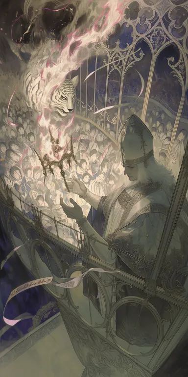 Midjourney Bot 更新时间:2026-03-26 00:21商业插画渲染,二次元塔罗风格,神秘主义元素,中世纪花纹装饰,教皇元素,场景设计,巨型的教堂玻璃墙壁,一个站在舞台上穿教皇服装的白色长胡子老者高举着燃烧着火焰的竖立的铁圈正面对着镜头,凶猛的老虎从高举头顶的竖立火圈穿梭而过,精彩瞬间的定格捕捉,细节纹理材质,背后是人山人海的观众,欢呼的彩带从天而降, --ar 1:2 --c 6 --weird 63 --stylize 204 --niji 7 --sref https://images.gogpt.vip/aigf/m_origin/20260220/140639/t73j9suxwfzhv3qk.png https://images.gogpt.vip/aigf/m_origin/20260220/140639/a7ou9sr36eidfrxe.png https://images.gogpt.vip/aigf/m_origin/20260220/140639/7k3f07puturs1vrr.png --sw 440