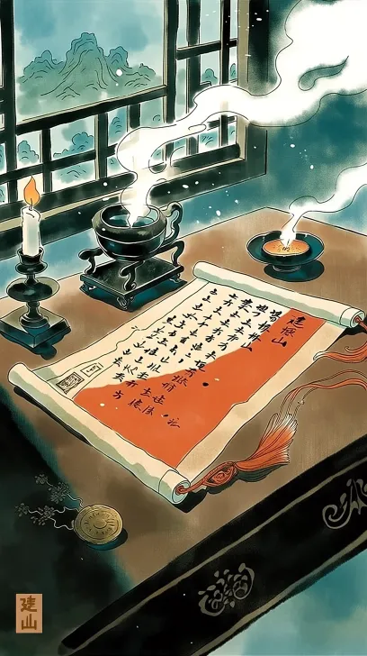 Midjourney Bot 更新时间:2026-03-26 00:24新国风水墨卡通插画,张大千风格,俯视构图,桌案上展开一卷黄绢诏书,朱笔御批“建寺恒山”,墨迹未干,玉玺压角,烛火微摇,香炉青烟袅袅,窗外远山如黛,云雾缭绕,氛围庄严肃穆,天命所归,赭石与靛青为主色调,画面留白,笔触细腻,Octane渲染,虚幻引擎光线追踪,电影感光效,高清画质,色彩鲜艳逼真,细节丰富生动 --ar 9:16 --stylize 100 --niji 7 --sref https://images.gogpt.vip/aigf/m_origin/20260325/2103473/zan9vwoz2vey10eb.jpg