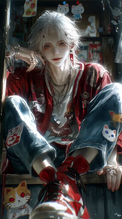 Midjourney Bot 更新时间:2026-03-26 00:25氛围感帅哥,白色长直发(玻璃光泽感)+许多银夹子(不规则),蓬松柔顺,额前碎发,绝美三色眼眸,眉眼清俊 配饰:手链+项链+耳钉+手上贴着凯蒂猫贴纸 穿着:红色拉链卫衣(宽松,自然)+蓝色宽松设计感牛仔裤+红色设计感运动鞋 姿势:坐在窗台上,一手撑着窗台,双腿随意摆放,姿势慵懒 风格:伪厚涂cg风格,bjd面容风格,油画感,清冷氛围,最高画质,极致氛围感,细节刻画,正面,满墙凯蒂猫贴纸背景,背景为温馨的小房间,姿势酷飒,背景严重模糊,室内柔光,光影大师,人物表情丰富,半厚的绘画技法,2.5D风格,背景细节丰富,厚涂绘画风格,超写实感,真实纹理,细节纹理,生活场景感,韩式厚涂 3D 艺术风格 --ar 9:16 --stylize 734 --niji 7