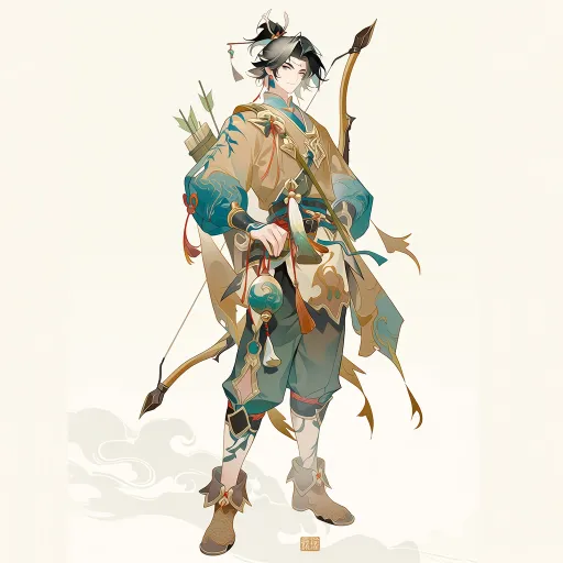 Midjourney Bot 更新时间:2026-03-26 00:25身形修长如青竹,墨色短发用竹簪束起,额前碎发垂落,眼尾带着竹叶状的墨色纹。上身是交领短打劲装,面料为染成竹青的粗麻布,袖口与衣摆绣着水墨竹枝纹样,腰间系着藏青色宽布腰带,悬着竹制哨子与装着驱虫草药的锦囊;下身是收口裤,脚蹬麻线编织的云纹布鞋,小腿缠着防刮的藤条护腿,背后斜挎着一把用老竹削成的短弓,箭囊里插着涂有迷迭香汁液的竹箭 --ar 1:1 --stylize 100 --niji 7 --sref https://images.gogpt.vip/aigf/m_origin/20260326/2101667/uvt9igkt0z8w5s61.jpg --sw 112