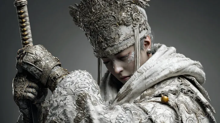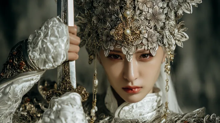 Midjourney Bot 更新时间:2026-03-27 00:03一位身穿华丽铠甲的神秘战士,身披复杂花纹的白色披风,装饰有金色和珠宝细节,手持一把精致的剑。头饰采用华丽的金属材质,呈现出复杂的花纹和纹理,仿佛是一种神圣的象征。整体形象神秘而庄重,暗示着力量与智慧。背景采用简约的灰色,突出主体的细节与光泽,展现出超高清的视觉效果,营造出令人惊叹的氛围 --ar 16:9 --v 7 --style raw --stylize 100