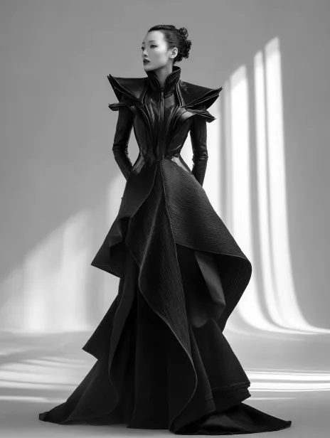 Midjourney Bot 更新时间:2026-03-27 00:04全身图,一位超模,身着暗黑先锋派雕塑感礼裙,带有未来主义铠甲式夸张肩型、极致收腰设计,裙身采用厚重皮革与罗纹针织面料打造出层叠波浪褶皱纹理。整体廓形修长且极具建筑感,饰有有机骨骼线条。黑白高对比时尚摄影,戏剧性侧光凸显立体造型,纯黑背景,地面投射柔和阴影,营造冷峻神秘的哥特未来主义氛围。全身竖幅构图,8K超写实画质,皮革纹理细节丰富,高端时尚大片风格,承袭瑞克·欧文斯与加勒斯·普的设计脉络,细节展示,纯白背景 --ar 3:4 --v 7 --stylize 100
