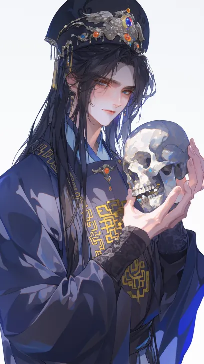 Midjourney Bot 更新时间:2026-03-27 00:04动漫插画,一个俊美动漫男人,抱着骷髅头,冷白皮,宽肩细腰,倒三角身材,宽胸 身材挺拔,站姿端正,宽臀,长黑发,清朝官服服饰,清朝官服帽子,玛瑙和珐琅饰 刺绣乌沙幞头,穿着长袖藏蓝色汉服,衣领敞开,衣襟/袖口有水波纹刺绣,长方形黄色runes,高品质,8K,线条流畅 --ar 9:16 --stylize 100 --niji 6 --no no