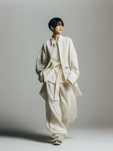 Midjourney Bot 更新时间:2026-03-27 00:05全身图,服装效果图,方寸无界,一位超模,新中式无界通勤时装系列,东方极简主义,利落克制剪裁,H型宽松长袍与连体裤廓形,可调节收腰腰带,宽松垂坠衣袖,简约结构分割,抗皱垂顺面料,细腻肌理质感,低饱和中性色(米白、雾灰、奶咖、炭黑),低调暗纹细节,现代都市通勤场景,干净利落,松弛优雅,多场景适配,专业又日常,8K超写实,全身竖幅构图,柔和均匀影棚光线,浅灰极简背景,高级时尚大片质感,细腻面料纹理,干净通透氛围,新中式未来极简风格,细节展示,纯白背景 --ar 3:4 --v 7 --stylize 100