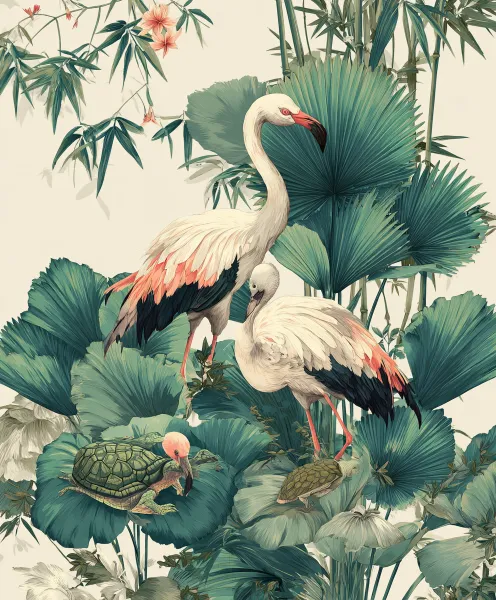 Midjourney Bot 更新时间:2026-03-27 00:05白色背景上有热带风情无缝印花,图案为粉色的火烈鸟穿插龟背竹与棕榈叶,扁平矢量插画风格,线条干净清晰,清新柔和配色(白、深绿、浅绿、黑、粉),高分辨率,适合纺织印花,无文字无水印 --ar 5:6 --v 7 --stylize 100