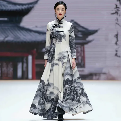 Midjourney Bot 更新时间:2026-03-27 00:08新中式旗袍走秀,水墨山水,立领盘扣设计,真丝质感,秀场背景,古典东方美学,模特端庄大气,现代化。 --ar 1:1 --v 7 --stylize 100