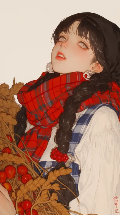 Midjourney Bot 更新时间:2026-03-27 00:08杰作,最佳质量,1位少女,黑双麻花辫,红格纹头巾+浆果装饰,蓝白田园裙,秋日麦田背景,温暖治愈氛围,厚涂插画,超细节,清晰对焦 --ar 9:16 --stylize 500 --niji 7 --profile ijk6fir --no 男人