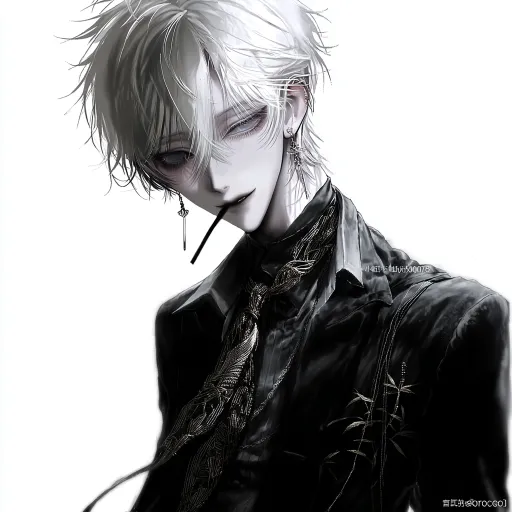 Midjourney Bot 更新时间:2026-03-27 00:09#风格ok94h28 cg,插画,黑白线稿,非真人,脸部精细刻画,阴鸷,男,黑发,头发蓬松,薄唇,鼻梁高挺,眼神凌厉,黑色丝绒西装(左肩上金色竹叶纹),内里黑色丝绒衬衫,流苏耳坠,嘴里叼着一根烟,背景黑色 --ar 1:1 --v 7 --stylize 100 --oref https://images.gogpt.vip/aigf/m_origin/20260326/2105202/g1tr3xss73mscn43.jpeg --ow 400