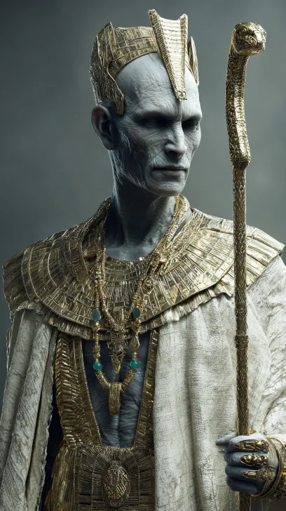 Midjourney Bot 更新时间:2026-03-27 00:13古埃及神庙最高统治者,大祭司,fullbody,55岁男性,中东与白人混血,苍白肤色,身形挺拔清瘦,纯白金线刺绣亚麻长袍,一尘不染,沉重华丽的黄金绿松石项圈,蛇头权杖,微眯双眼,下巴高傲抬起,嘲弄神情,精于算计的紧张感,绝对神权垄断者,神圣威严,古埃及神庙背景,电影级光影,超高清细节 --ar 9:16 --v 7 --style raw