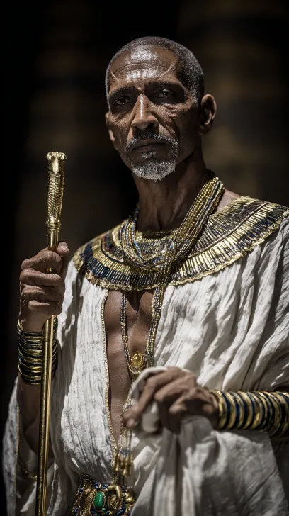 Midjourney Bot 更新时间:2026-03-27 00:15古埃及神庙最高统治者,大祭司,fullbody,55岁男性,中东与白人混血,英俊的五官,身形挺拔清瘦,纯白金线刺绣亚麻长袍,一尘不染,沉重华丽的黄金绿松石项圈,蛇头权杖,微眯双眼,下巴高傲抬起,嘲弄神情,精于算计的紧张感,绝对神权垄断者,神圣威严,古埃及神庙背景,电影级光影,超高清细节 --ar 9:16 --v 7 --style raw