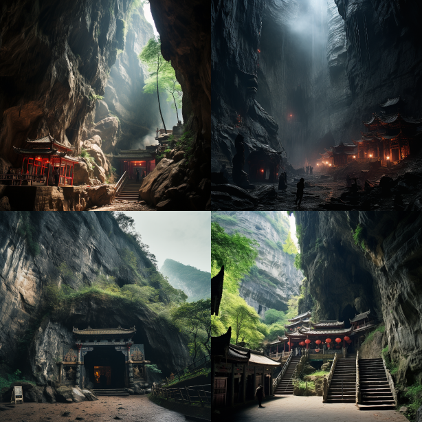 Midjourney Bot 更新时间:2023-08-26 15:47The four master and disciples arrived at the foot of the demonic cave, where a sinister purple mist lingered. --ar 1:1 --style raw --v 5.2