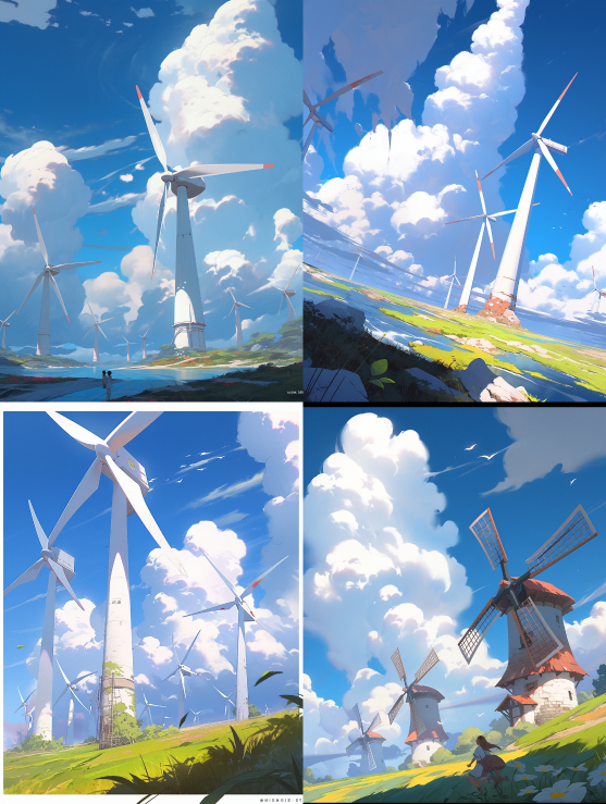Midjourney Bot 更新时间:2023-08-26 14:33Summer, refreshing, blue sky, white flowing clouds, big windmills, gentleness, illustrations, atmosphere, masterpiece, exquisite and perfect --no Person --ar 3:4 --style expressive --niji 5