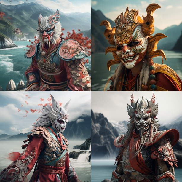 Midjourney Bot 更新时间:2023-08-26 14:38Zhang Fei,documentary photography,3D rendering,Chinese opera mask,Mountains and Seas Sutra,Rocker fashion,game assets --ar 1:1 --style raw --v 5.2
