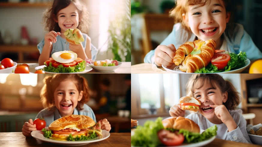 Midjourney Bot 更新时间:2023-08-26 14:31A little girl was holding a golden croissant in her hand, about to happily take a bite. There is a piece of lettuce, ham sausage, cheese, fried eggs, tomatoes, and bacon inside the bread, healthy green, wide angle --ar 16:9 --style raw --v 5.2