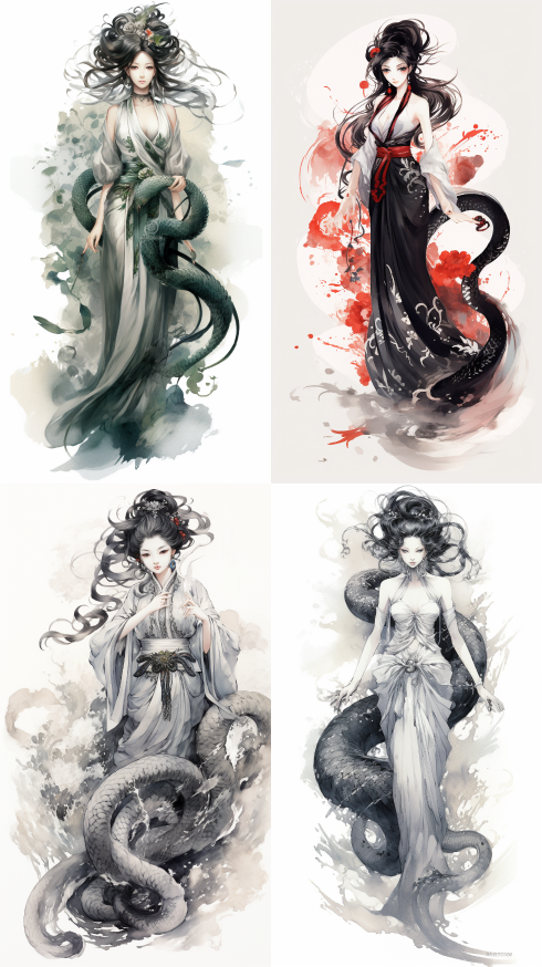 Midjourney Bot 更新时间:2023-08-26 14:37Snake demon, a classical beauty in ancient China, Hanfu (traditional Chinese clothing), ink wash style. --ar 9:16 --style raw --v 5.2