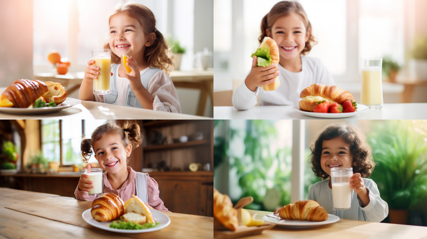 Midjourney Bot 更新时间:2023-08-26 14:37A little girl was holding a golden croissant in her hand, about to happily take a bite. There is a piece of lettuce, ham sausage, cheese, fried egg, tomato, bacon inside the bread, and next to it is a glass of milk, healthy green, wide angle --ar 16:9 --style raw --v 5.2