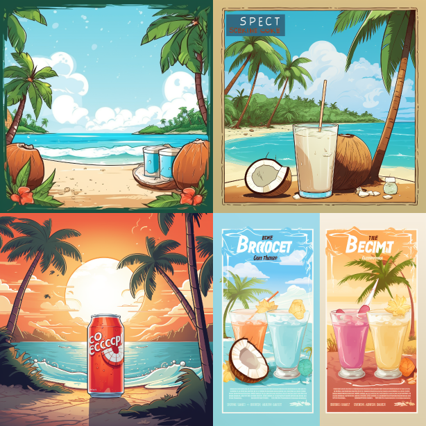 Midjourney Bot 更新时间:2023-08-26 14:38Design a poster that includes beaches, coconut trees, anime style, and a promotional poster for a beverage --ar 1:1 --style raw --v 5.2