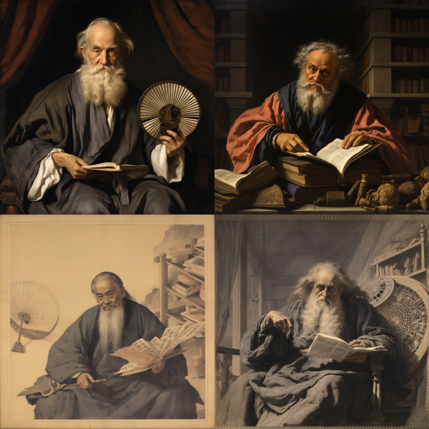 Midjourney Bot 更新时间:2023-08-26 14:37An elderly man, wearing a robe and holding a fan, is very wise. Behind him is a study, which contains many books and tells philosophical stories --ar 1:1 --style raw --v 5.2