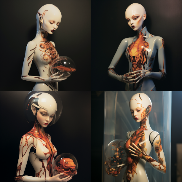 The female robot holds a fish tank with a goldfish in her hand, representing the ultra-modernism. The porcelain of the porcelain machine is made of synthetic skin, with a female face half covered, while holding the fish tank. --ar 1:1 --v 5.2 --style raw --s 750