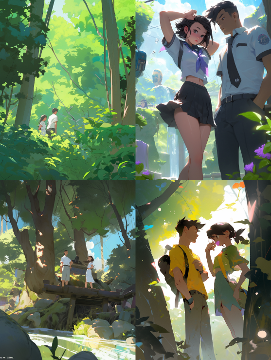 In the daytime, wutong trees, green trees, sunshine, small people, two figures, figure figure figure, far shot, handsome high school boy and lovely girl standing together, making a masterpiece, exquisite and perfect --ar 3:4 --style expressive --niji 5