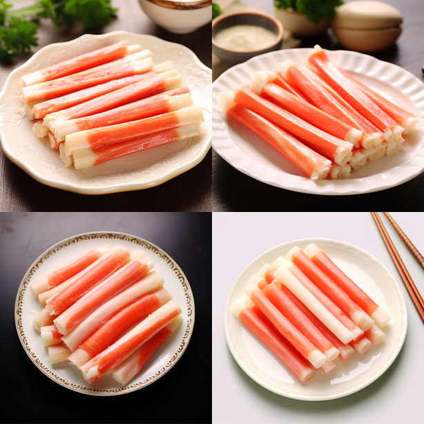 A plate filled with crab sticks, steaming hot. Behind the plate, there is a row of unopened crab sticks, using a natural and realistic photography technique. There is a thumb next to it, which is delicious but not expensive. Happiness doubles with words, emphasizing products, and soft lines --ar 1:1 --style raw --v 5.2
