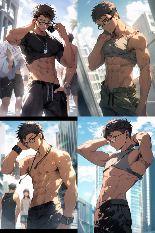 Frontal view,medium full shot,a 25 years old young handsome male,crew cut,perfect face,trim physique,athletic build,pectorals and abdominals,black sunglasses,topless,no shirts,without shirts,none shirts,putting both hands by sides,bright day,city background,Makoto Shinkai,in the style of 2D Japanese Anime,beautiful cinematic lighting,Official Art,Pixiv Fanbox,Digital Art,Epic Portraiture,Ultra Detailed,32K Resolution,Vibrant Colors,Vivid Colors,Bright Colors,Masterpiece,Best Quality,Post Processing. --ar 2:3 --style original --niji 5