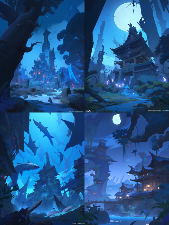 The ancient scene of the dark night, with a combination of blue and white, a blue and white landscape, and an ancient scenery. --no Person --ar 3:4 --style expressive --niji 5