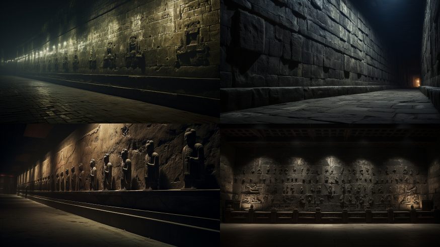 wall of a Qin Dynasty tomb, dark --ar 16:9 --style raw --v 5.2