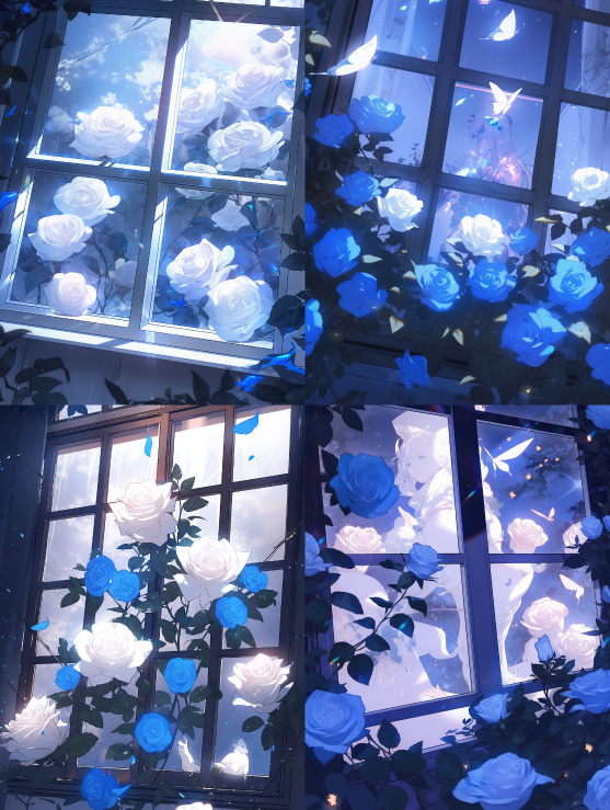 It's snowing outside the window, some white roses, a blue and white glowing butterfly, the night sky, masterpiece, exquisite and perfect --no Person --ar 3:4 --style expressive --niji 5