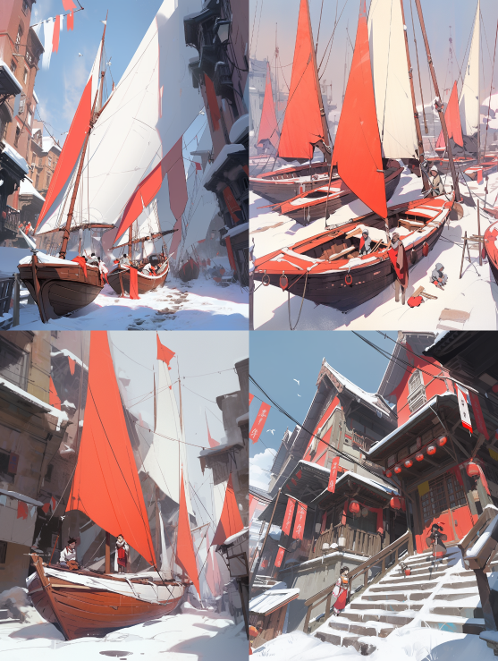 Linzhou yearns for snow with thousands of sails, lingering in the city with thousands of knots. The red and white color scheme exudes a sense of atmosphere in the landscape, creating a masterpiece that is exquisite and perfect. --no Person --ar 3:4 --style expressive --niji 5 --s 250
