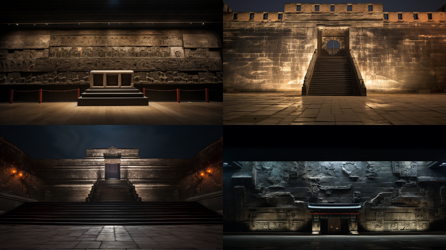 front view of the wall of a Qin Dynasty tomb, dark --ar 16:9 --style raw --v 5.2