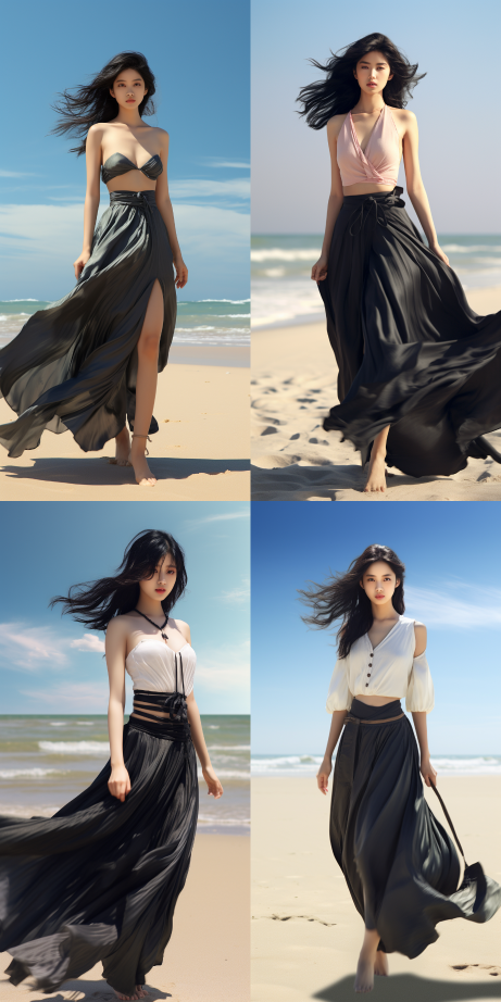 3D black haired Chinese beauty wearing a long skirt running on the beach, side panoramic realistic photo style --ar 1:2 --style raw --v 5.2