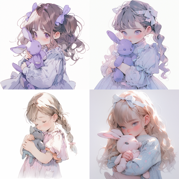 The brown double ponytailed girl in a doll dress is holding a toy rabbit, with a matte texture and transparent colors, Imitate Hiromu Arakawa's painting style, Dream colors, delete skin texture, low capture, Dream colors, low capture, Dream colors, Matte, surrealism, sad, Lavender tones, Lavender tones, Crystal Blue tones, white background, shirt Pajamas --s 227 --ar 1:1 --niji 5