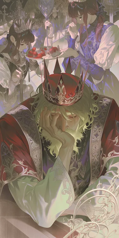 Midjourney Bot 更新时间:2026-03-23 00:22商业插画渲染,二次元塔罗风格,神秘主义元素,中世纪花纹装饰,皇室元素,一个绿色胡子的瘦弱矮小小老头,戴着红色的王冠,披着红色的王袍,沮丧的坐在自己王座上,一只胳膊撑着脸颊,旁边的一位侍女端着水果盘子,另一个侍女撑着宫廷蒲扇, --ar 1:2 --stylize 260 --niji 7 --sref https://images.gogpt.vip/aigf/m_origin/20260220/140639/t73j9suxwfzhv3qk.png https://images.gogpt.vip/aigf/m_origin/20260220/140639/a7ou9sr36eidfrxe.png https://images.gogpt.vip/aigf/m_origin/20260220/140639/7k3f07puturs1vrr.png --sw 149