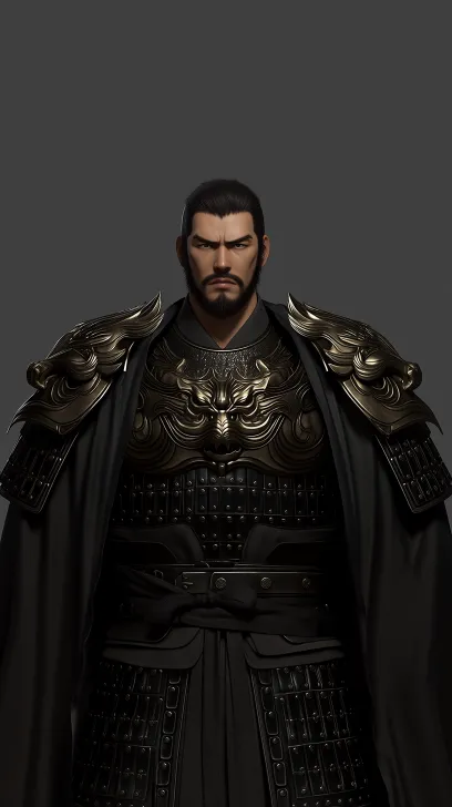 Midjourney Bot 更新时间:2026-03-24 00:01秦朝将领蒙恬的全身正面3D渲染照,45岁左右男性身高185cm,汉族特征黑色短发整齐短须,方形硬朗脸庞轮廓分明,浓密剑眉炯炯有神坚毅眼神,高挺笔直鼻子魁梧九头身身材威严站立。身着重型黑金玄甲甲片层叠有序,狰狞兽首护肩,腰间宽大皮革腰带内衬深色战袍,披黑色厚重披风金属质感皮革细节秦代将领风范。背景纯灰色无文字干扰。CG动画风格国风3D动漫,虚幻引擎渲染电影灯光效果高质量细节逼真画面。 --ar 9:16 --stylize 30 --niji 7