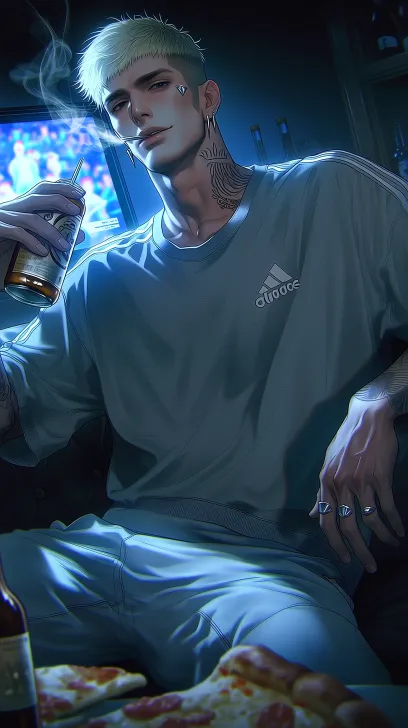 Midjourney Bot 更新时间:2026-03-24 00:02一位20岁意德混血男子,浅金色短刺猬头,漂染眉毛,黑色深邃眼睛,高眉骨鼻梁,厚嘴唇带攻击性松弛感。195cm高壮挺拔身躯,宽肩窄腰,手臂小腹淡青血管浮现,薄肌火辣性感身材。鼻梁上钛钢长尖刺山根钉,两侧眉毛眉头上下竖穿钛钢眉钉,右耳五枚尖刺耳钉。脖子上缠绕花体字纹身。身着浅灰色宽松adidas连帽衫,浅蓝色牛仔裤。 背后视角,俯拍视角半身特写,昏暗客厅男子靠坐在沙发,饶有兴致转头注视镜头,左手握着啤酒罐,嘴里叼烟飘散烟丝,右手搭在沙发靠背上,眼神深邃忧郁。背景电视闪烁足球赛蓝光,桌上散落啤酒瓶和披萨,阴影斑驳。电影级伪厚涂技法,2.5D肌肤质感细腻如真人,低保真青调滤镜融合细腻颗粒,虚幻引擎渲染高对比光影强化钛钢饰物冷冽光泽与烟光缭绕,亚文化美学风格贯穿阴暗氛围。 细腻肤质,史蒂文·克莱因,黑光,亚历山大·麦昆,半身, --ar 9:16 --stylize 100 --niji 7