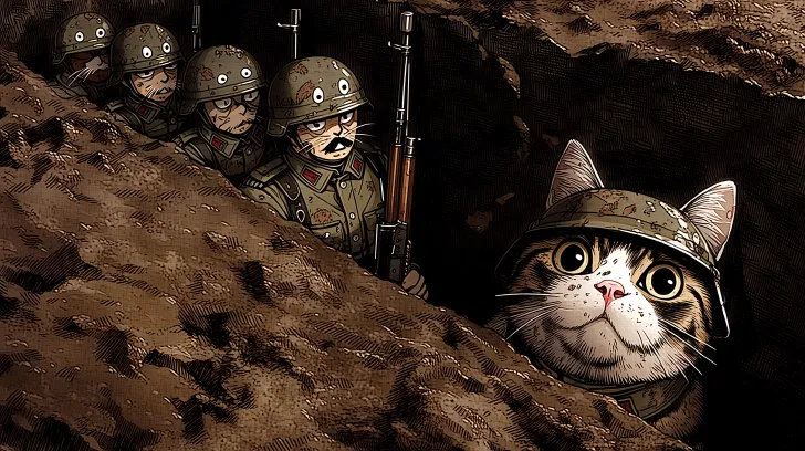 Midjourney Bot 更新时间:2026-03-24 00:03全景 猫的视角,身处泥泞的战壕,耳边是刺耳的枪炮声,身边是满脸尘土、疲惫不堪的士兵战壕角落 • 景别:全景,低角度仰拍 • 运镜:缓慢推进 • 画面构图:泥泞战壕,坑洼地面,士兵靠在战壕壁,林屿变成的小猫缩在角落 • 核心元素:枪炮声、尘土、疲惫的士兵、紧张压抑的战场氛围 • 手绘重点:深褐色战壕,士兵面部模糊,突出混乱与压抑 --sref 314159 --ar 16:9 --weird 1719 --niji 7 --sref https://images.gogpt.vip/aigf/m_origin/20260323/2100364/072h9xcpwr8aa5kc.jpeg https://images.gogpt.vip/aigf/m_origin/20260323/2100364/tlo8qv6jbtthzgih.webp --sw 0