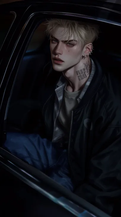 Midjourney Bot 更新时间:2026-03-24 00:08一位20岁意德混血男子,浅金色短发,漂染眉毛,黑色深邃眼睛,高眉骨鼻梁,厚嘴唇带攻击性松弛感。195cm高壮挺拔身躯,宽肩窄腰,手臂淡青血管浮现,薄肌火辣性感身材。鼻梁上钛钢长尖刺山根钉,两侧眉毛眉头上下竖穿钛钢眉钉,右耳五枚尖刺耳钉。脖子上有大面积的花体字纹身。身着黑色飞行夹克,内搭灰色乱纹衬衫,下穿深蓝色牛仔裤。 半身特写,男子坐在车门关着的黑色英帕拉驾驶座,看着窗外,周围环境昏暗。 电影级伪厚涂技法,2.5D肌肤质感细腻如真人,低保绿色调调滤镜融合细腻颗粒,虚幻引擎渲染高对比光影强化钛钢饰物冷冽光泽与烟光缭绕,亚文化美学风格贯穿阴暗氛围。 细腻肤质,史蒂文·克莱因,黑光,亚历山大·麦昆,半身, --ar 9:16 --stylize 100 --niji 7