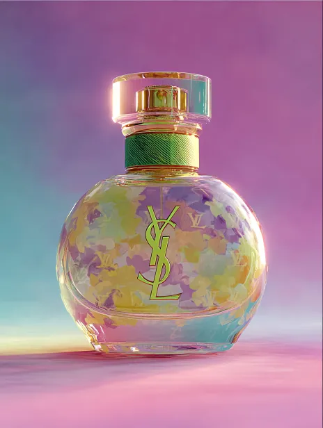 Midjourney Bot 更新时间:2026-03-23 00:22https://images.gogpt.vip/aigf/m_origin/20260323/2098529/rglerpkoj43g3u6s.jpg Generate a bottle of perfume, with a Chinese sandalwood base (with patterns) underneath. The perfume features the Saint Laurent logo and has a gradient light pink bottle body, surrounded by light yellow and light purple flowers. The bottle cap should be transparent and droplet-shaped, with a spring green transparent wide ribbon around the bottle. The bottle has a vase shape and exhibits a Tyndall effect. (The background image should just be a base color.) --ar 3:4 --v 7 --stylize 100 --iw 0.25