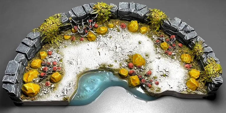 Midjourney Bot 更新时间:2026-03-23 00:23https://images.gogpt.vip/aigf/m_origin/20260322/2098921/s10g9wfk22rkt5nk.jpg Based on the provided reference image, help me generate a top view of a real-life model. All objects are arranged according to the layout of the reference image. The white ground is composed of sand grains and crystals, some of the ground is covered with moss, the yellow area is irregular rocks, and some rocks are covered with vines and moss. The height of the rocks varies greatly. The blue area is the colorful crystal lake surface, and the red area is the lighthouse base. Only the lower half of the lighthouse remains, and the lighthouse is covered with colored moss. Dreamy colors, ultra-high definition, high resolution, cinematic texture, realistic feeling, --ar 2:1 --v 7 --stylize 100 --iw 0.25 --sref https://images.gogpt.vip/aigf/m_origin/20260322/2098921/s10g9wfk22rkt5nk.jpg --oref https://images.gogpt.vip/aigf/m_origin/20260322/2098921/rktk1ojex9p0pp2u.png --ow 100