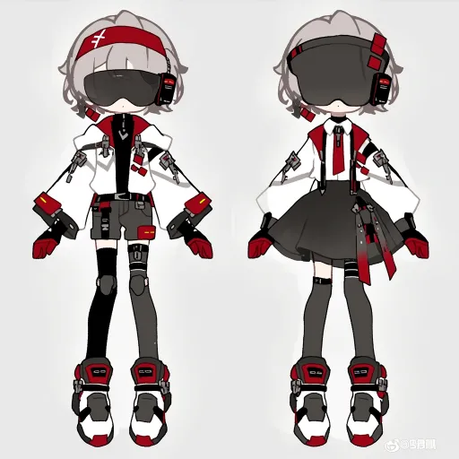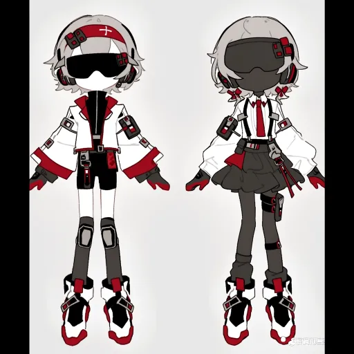Midjourney Bot 更新时间:2026-03-23 00:08https://images.gogpt.vip/aigf/m_origin/20260322/1686785/2m7nvym2au5jg5we.png 左侧人物(机能酷飒风·红白黑系) 整体风格:酷飒机能风,以白、红、黑为主调,利落干练,充满未来科技感。 发型与头饰: - 浅灰短发,搭配红色发带(饰十字小标),佩戴黑色墨镜与侧边通讯器,科技感拉满。 上衣: - 内搭黑色高领,外穿白红拼接短款机能外套,袖口宽大,装饰金属扣、红色镶边,搭配黑红拼接手套,利落有型。 下装: - 黑色机能短裤,侧边有红色方块装饰,搭配黑色护膝,强化机能感。 鞋袜: - 黑红拼接长筒袜,搭配白红黑拼色厚底机能鞋,鞋身有金属扣、绑带设计,适配机能风格。 配饰: - 红色发带、黑色墨镜、侧边通讯器、金属扣、护膝,细节精致,强化酷飒机能感。 右侧人物(甜酷机能风·红白黑系) 整体风格:甜酷机能风,以白、红、黑为主调,混搭短裙与机能元素,俏皮又利落。 发型与头饰: - 浅灰短发,侧边有红色方块装饰,佩戴黑色眼罩与通讯器,甜酷兼具。 上衣: - 内搭白色衬衫,系红色领带,外穿白红拼接短款机能外套,袖口宽大,装饰金属扣、红色镶边,搭配黑红拼接手套,元气利落。 下装: - 黑色百褶短裙,侧边有红色飘带、金属扣装饰,甜酷感拉满。 鞋袜: - 黑红拼接长筒袜,搭配白红黑拼色厚底机能鞋,鞋身有金属扣、绑带设计,适配机能风格。 配饰: - 红色方块装饰、黑色眼罩、通讯器、金属扣、飘带,细节丰富,强化甜酷机能感。 --ar 1:1 --iw 2 --niji 7