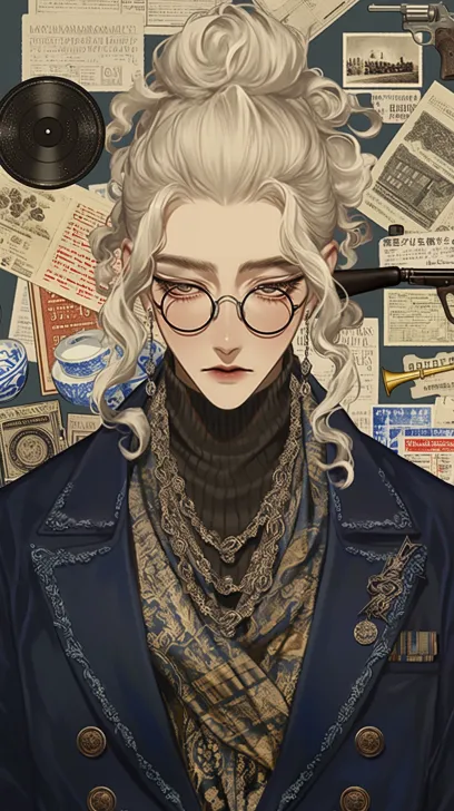 Midjourney Bot 更新时间:2026-03-23 00:14一个俊美动漫男人,暗青色盘扣外套、丝质围巾、发髻、米白色长卷发+头顶直发+发梢微卷、圆框眼镜+长睫毛+垂下眼睛、珠链项饰品,烟雾缭绕makeup, (黑胶唱片、票据账本、火柴盒、老照片、车票、青花瓷茶盏、军号、枪械(毛瑟手枪))背景,漫画风格, --ar 9:16 --style raw --stylize 100 --niji 6 --no no