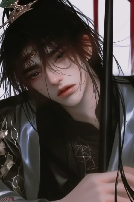Midjourney Bot 更新时间:2026-03-23 00:07https://images.gogpt.vip/aigf/m_origin/20260322/2098933/jhmy18hili7ijmyw.jpeg https://images.gogpt.vip/aigf/m_origin/20260322/2098933/ww4glj80560u8hgu.jpeg High angle close-up, with characters occupying about 80% of the screen. The ancient style male god has long black hair tied up by a jade crown, a high ponytail, and a slightly messy hairstyle with natural curves, with a few strands of hair scattered in front of the forehead. Black pupils, clear and bright eyes, with a slight sense of alienation. Exquisite three-dimensional facial features, fair skin, and clear jawline. Wearing a black fitted long gown. The background is a dynamically blurred ancient style scene, creating a sense of capture. The movements are natural and random (such as glancing back or leaning against the wall playing with a sword), and the overall atmosphere is an ancient, clean, and story driven Japanese film style, with soft light and shadow, and high-definition picture quality. --sref 5278 --ar 2:3 --stylize 100 --iw 0.25 --niji 6 --sref https://images.gogpt.vip/aigf/m_origin/20260322/2098933/jhmy18hili7ijmyw.jpeg https://images.gogpt.vip/aigf/m_origin/20260322/2098933/ww4glj80560u8hgu.jpeg --cref https://images.gogpt.vip/aigf/m_origin/20260322/2098933/2cn1dwryeesecl0g.png https://images.gogpt.vip/aigf/m_origin/20260322/2098933/lq5y0lu5c728sj5y.png --cw 100 --sw 271 --profile fte58en --no 现代元素,未来科技