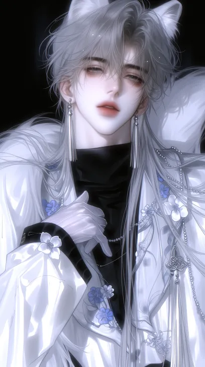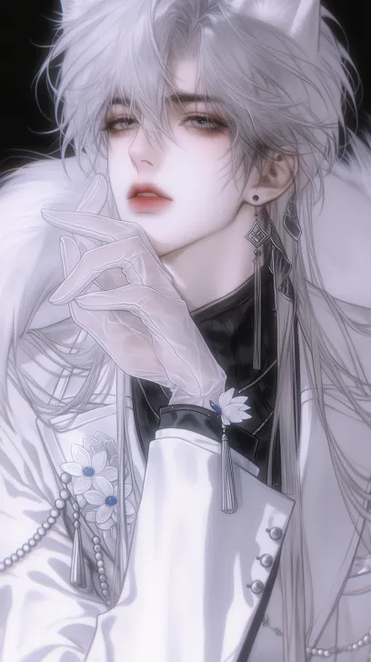 Midjourney Bot 更新时间:2026-03-23 00:20A portrait of a young ancient-style swordsman, facial close-up, close-up shot. He has very long gray hair, which falls over his shoulders, with a long side-swept fringe draping down both sides of his face to his chest. On top of his head are a pair of white fox ears, and behind him is a white fox tail. His eyelashes are long, his expression calm, his eyebrows well-defined, and his skin slightly pale. He is dressed in a modern style men's formal suit that combines elements of traditional Japanese fashion, with pure white as the base color, featuring a crossover collar suit design embellished with blue core white floral decorations; large wide sleeves attach at the shoulders, and the cuffs and hem are adorned with round beads, with silver tassels hanging beneath the white floral decorations. Underneath, he wears a black turtleneck and elbow-length sheer white gloves, with cuffs edged in black, and a small white flower of the same style as his outfit hanging at the wrist. It is a clean and elegant new Chinese-style men's formal attire. The color tone of the image is soft, leaning towards red and gray, with strong color contrast and extremely detailed treatment. The character occupies the entire screen, creating a dark overall atmosphere. The art style is anime realistic, with a melancholic expression on the character's face, pupils appearing black, eyes and eyebrows delicate, with blurred lines, each strand of hair distinct, richly layered paint, and semi-thick painting technique. Broad shoulders and slim waist. Fair skin, long eyelashes, gentle light and shadow. Ultra-fine, sharp focus, high resolution, clear facial contours, complex fabric textures with wide transparency, gentle light and shadow, upper body close-up, exquisite details, elegant colors, semi-realistic and semi-thick painting style, delicate eyebrows and eyes, the image is clear and focused. The overall atmosphere is luxurious and romantic, with rich and bright colors, and layers of light and shadow that highlight the character's noble temperament. 8k resolution, perfect rendering, perfect composition. --ar 9:16 --stylize 200 --niji 7 --profile wr1xvzl