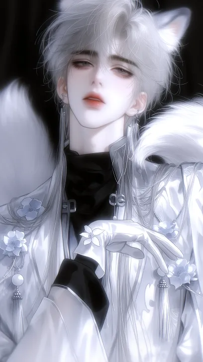 Midjourney Bot 更新时间:2026-03-23 00:12A portrait of a young swordsman, close-up of the face, in the foreground. He has long gray hair that drapes over his shoulders, with a lengthy side-swept fringe falling on either side of his cheeks to his chest. Atop his head, there are a pair of white fox ears, and behind him is a white fox tail. He has long eyelashes, and his expression appears sad and wounded; his eyebrows are sharply defined, and his skin is slightly pale. He wears a modern, improved men's formal suit combining elements of traditional Japanese style, primarily in pure white, featuring a crossover lapel suit cut, adorned with blue-centered white floral decorations; the shoulders connect to wide sleeves, with round beads embellishing both the cuffs and the edges of the train. Below the white floral decoration hangs silver tassels; he has a black turtleneck underneath, thin white gloves made of sheer fabric that extend past the elbows, and the cuffs are trimmed with black edges. A small white flower, matching the outfit, is attached at the wrist, presenting a clean and elegant new-style Chinese men’s formal attire. The color palette of the image is soft, leaning toward red and gray, with strong color contrasts and extremely fine details. The character occupies the entire screen, creating an overall dark atmosphere. The art style is anime realism, with the character's expression being melancholic, pupils appearing black, and having delicate eyes and eyebrows, with blurred lines; he gazes up at the camera, each strand of hair distinctly visible, featuring exquisite thick and semi-thick painting techniques. Broad shoulders and a slim waist. Fair skin, elongated eyelashes, and soft light and shadow effects. Ultra-fine, sharply focused, high resolution, with clear facial contours and complex clothing textures in wide perspective, soft light and shadow, upper body close-up, intricate details, elegant color scheme, semi-realistic and semi-thick painting style, with refined brows and eyes, and a clear, focused image. The overall atmosphere is luxurious and romantic, dominated by deep pink, crimson, and black hues, with rich and bright colors and layered light and shadow that highlight the character's noble temperament, in 8k resolution, with perfect rendering and composition. --ar 9:16 --stylize 200 --niji 7 --profile wr1xvzl