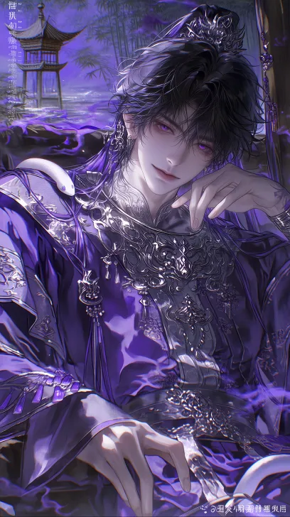 Midjourney Bot 更新时间:2026-03-20 00:15俊美痞帅中国古代苗疆长发少年,墨色长发,头上有复杂苗疆发饰,身姿清俊,面容浓昳丽俊美妖艳,紫色眼眸,眼尾泛红,耳朵上有银质华丽耳饰,一身紫色苗疆风格男装,银质苗疆颈环,衣服材质飘逸柔软,民族风元素,五毒绣纹,流苏披肩,衣着松垮,身姿挺拔,腰间有银铃流苏装饰,衣服有零散绣纹,妖艳俊美懒散气质,神情魅惑帅气深情,微笑邪魅,身上挂一条白紫色小蛇,手部互动,面部特写细致,斜侧下方向上拍摄,半身像,近景,背景苗疆紫竹林吊脚楼,流水清泉,紫烟特效。半厚涂写实,2.5D质感,迷幻光影层次,特效渲染,电影感半身构图,高清锐利4K画质,画中画/框架构图,厚涂,细节丰富,伪bjd脸,伪真人感,极致光影,极致面部特写,和谐配色,对比强烈,聚焦面部,清透感,精致眉眼,清晰聚焦,半厚涂写实,插画构图,数码高清写实,理光gr质感,头像脸部特写镜头,光影层次立体,古风,国风,精致,4K画质 HD,黄金时刻,杰作,masterpiece,best quality,真实细腻质感 --ar 9:16 --stylize 569 --niji 7 --no 短发 short hair