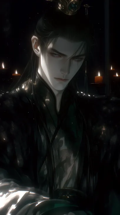 Midjourney Bot 更新时间:2026-03-20 00:15https://images.gogpt.vip/aigf/m_origin/20260319/2045420/ym0139yyi20z5ek5.png https://images.gogpt.vip/aigf/m_origin/20260319/2045420/16czaj1i6mifx4yz.png 构图特写面部,40岁古风男性角色,权倾朝野的内廷掌权者。气质阴鸷,冷白肤色,鼻梁挺直,薄唇色浅;细长凤眼微微低垂,眼神带着审视与轻蔑。黑色长发半束半散,垂至腰间,中式束发发冠为暗金墨玉材质,造型简洁却尽显贵重。身着深色宫廷服饰,主色调为玄黑、墨绿、暗金;衣料厚重垂坠,层次叠搭严整,细节处饰有低调蟒纹、云纹或暗纹织锦,不使用龙纹,自带压迫气场。手指修长干净,姿态从容,散发绝对掌控力。 场景在宫廷深处或昏暗内殿,以冷光为主,少量烛火暖光勾勒轮廓,光从人物侧下方打来,逆光形成强烈明暗对比。低饱和深色调,光影锐利对比强烈,画面仰视带有透视张力, 逼真的手绘美术风格,暗调中式光影,墨色粒子缓缓漂浮,最佳画质,戏剧性的光影,8K。 --ar 9:16 --c 15 --stylize 175 --niji 7 --no 戒指,耳环,项链