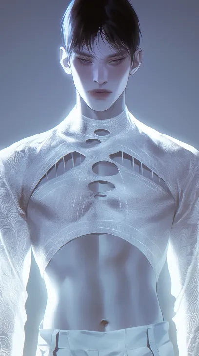 Midjourney Bot 更新时间:2026-03-21 00:00视觉系帅哥,浅白色hue,细线画,日韩漫画,暖色调。清晰8K。黑色直发,黑眼睛,冷漠的眼睛,冷白皮,嘴唇浅色,帅气的男人,穿白色缂丝透光衬衫,左右腰腹部镂空,身材挺拔,长身玉立,淡色,透明感肌,身材挺拔,长身玉立,清冷,静谧蓝,低饱和,雾感,冷白皮,站着,低角度仰拍 --ar 9:16 --style raw --stylize 100 --niji 6 --no no