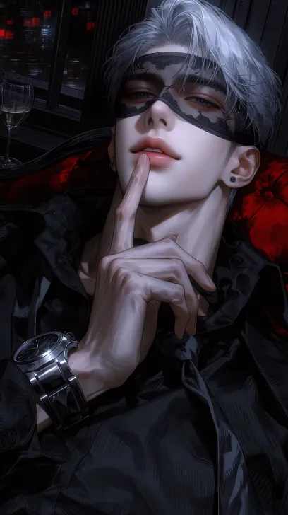 Midjourney Bot 更新时间:2026-03-21 00:02杰作,最高品质,CG渲染,厚涂质感。写实风格.极其细致,完美解剖,手势正确,高层俱乐部包厢,深色天鹅绒沙发,落地窗,模糊的霓虹夜城景,桌上半杯酒杯,成男,白发散散落额头,苍白皮肤,五官锐利,黑帮老大,黑色定制西装,敞领,宽肩,窄腰,奢华机械手表, 靠坐在沙发上,眼睛被薄纱黑色蕾丝眼罩遮住,嘴角带着一抹傲慢的微笑,食指和中指放在下唇上,慵懒而挑逗的姿态, 暗冷色调,深黑银灰色调,细腻的奶油白与深红点缀,戏剧性低调的灯光,高对比度,奢华诱惑的氛围,强烈的占有感和挑逗,面部特写,俯拍视角 --zoom 1.5 --ar 9:16 --stylize 390 --niji 7 --profile mbcm5ci pv5mwtt 5oroasi 552y3i1 jktkk9o ijk6fir --no 纹身